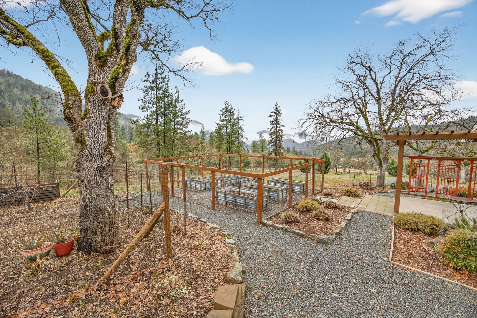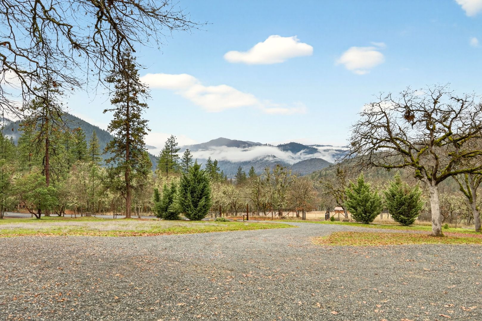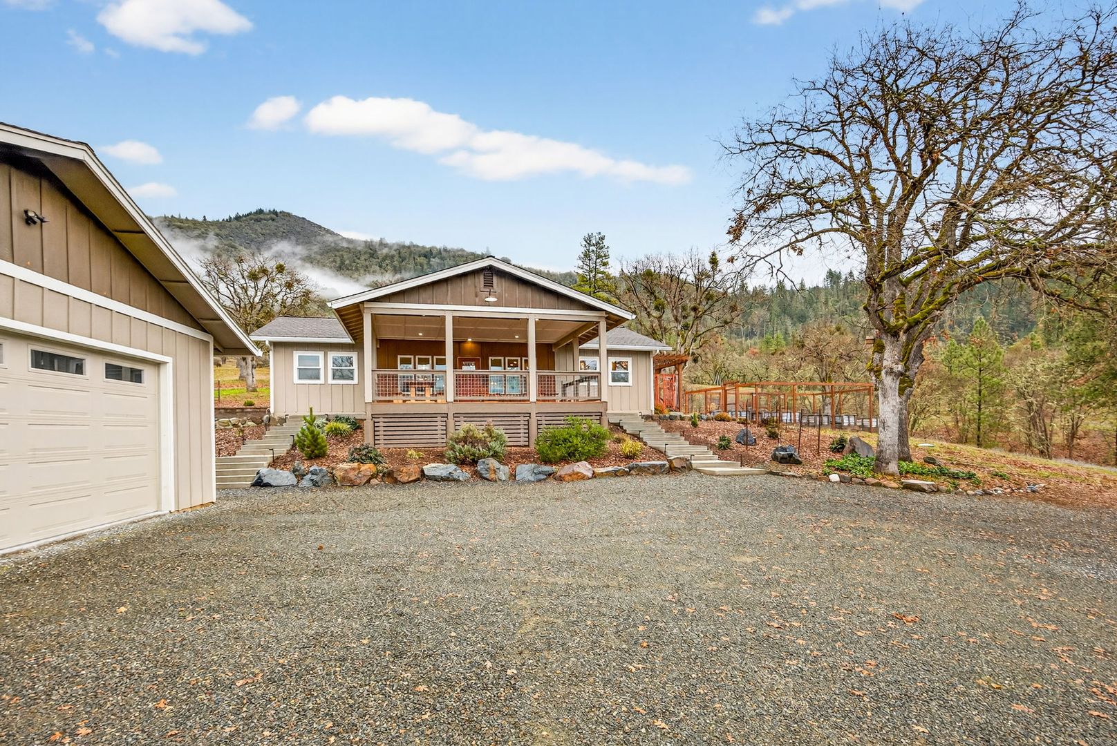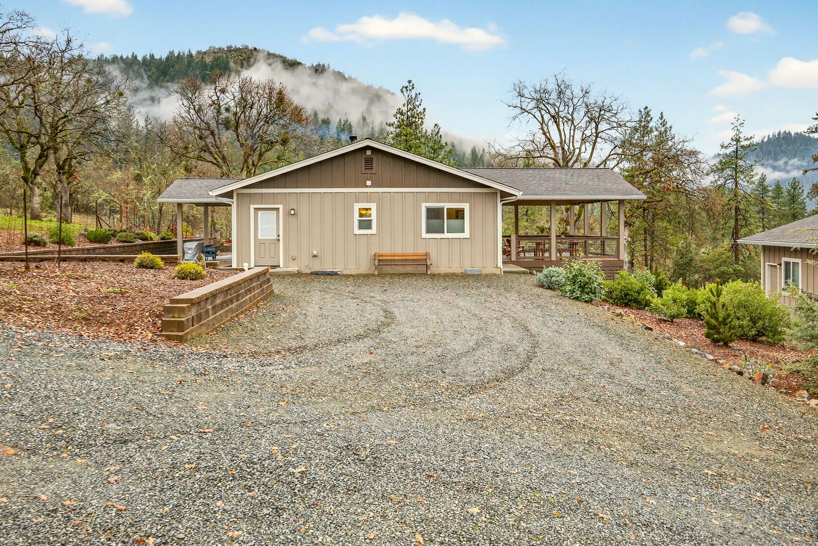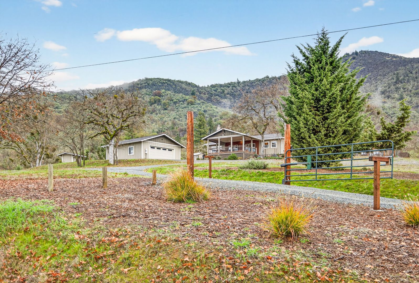Situated between Jacksonville and Grants Pass, this beautifully maintained country home sits on over 4 acres and offers peaceful Applegate Valley views from the covered front deck. The open-concept 2 BD 2 BA layout features solid oak hardwood floors, vaulted ceilings, and a spacious living room w/ a wood stove that opens to the kitchen and dining area. The kitchen includes granite countertops, a butcher block island, custom cabinetry, stainless appliances, and a farmhouse sink. A generous pantry off the kitchen provides exterior access and connects to the guest bathroom that doubles as a laundry room. The primary suite opens to a private patio overlooking the garden and features an ensuite with walk-in shower, double vanity, and touch-light mirrors. Outside you’ll find a detached 2 car garage, fenced in garden, fruit trees, wood storage, and manicured grounds. Offered on a month-to-month rental agreement, w/ the hope of securing a long-term tenant. Landscape maintenance is included.