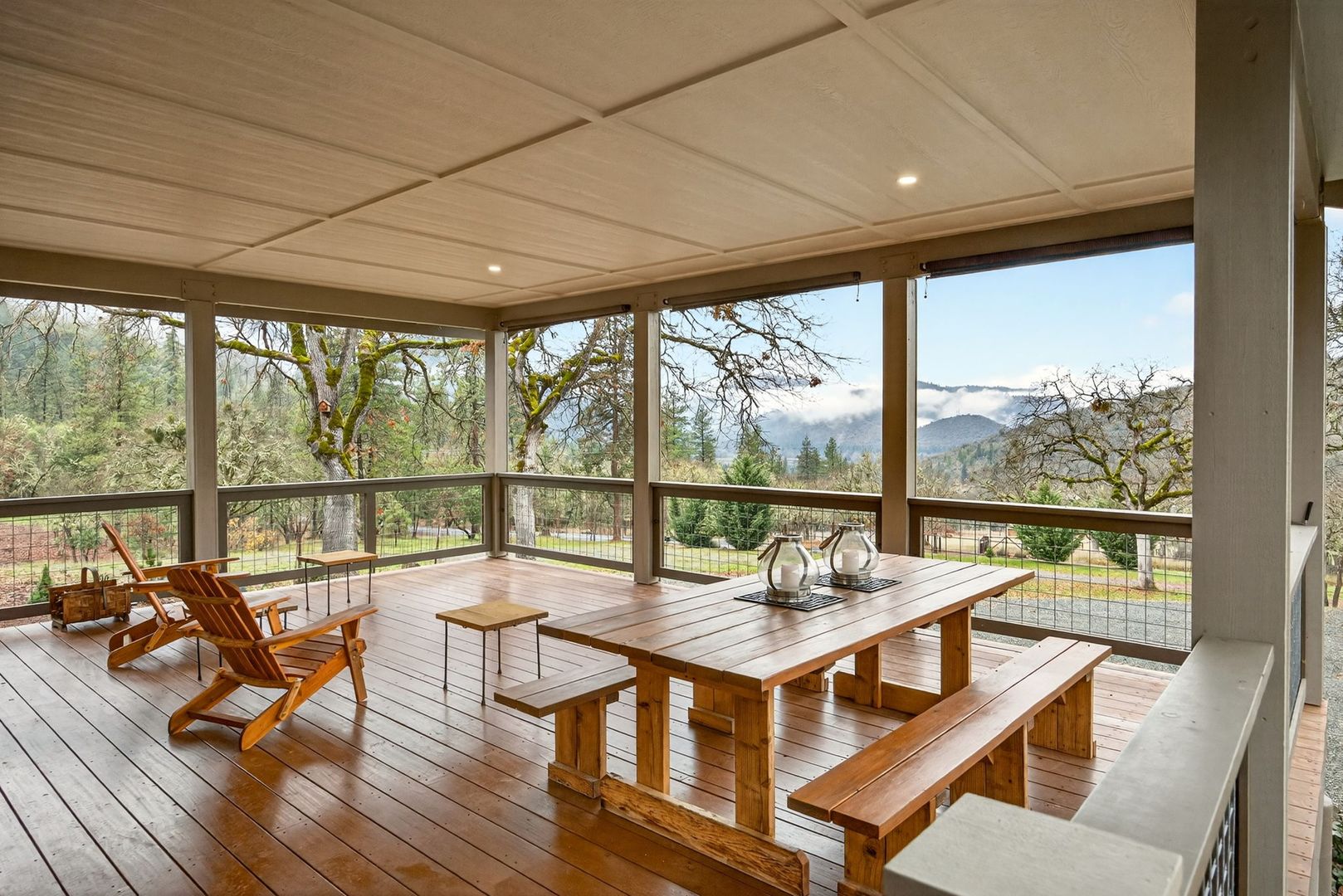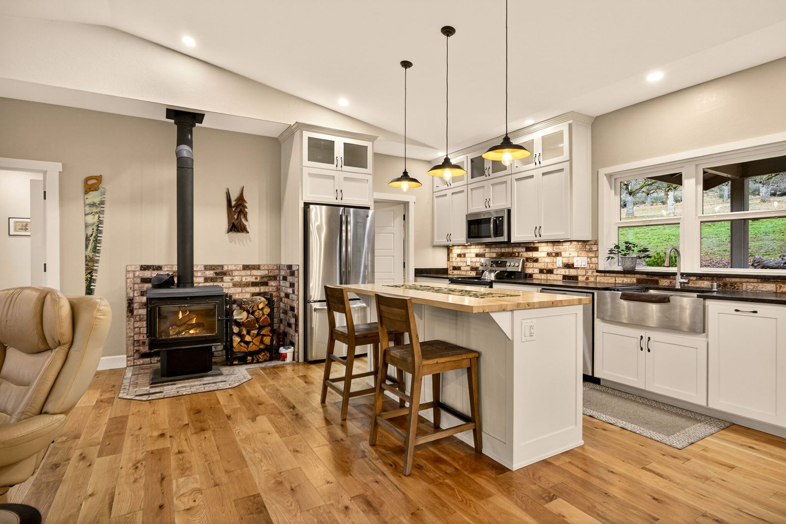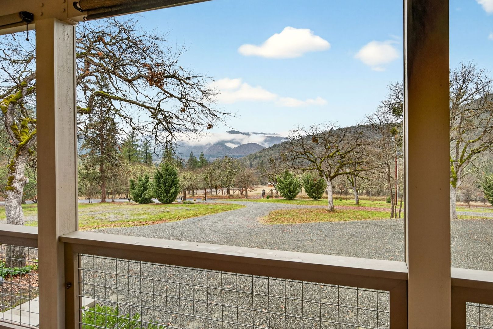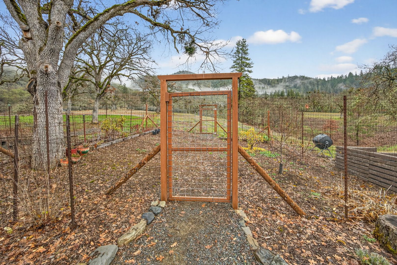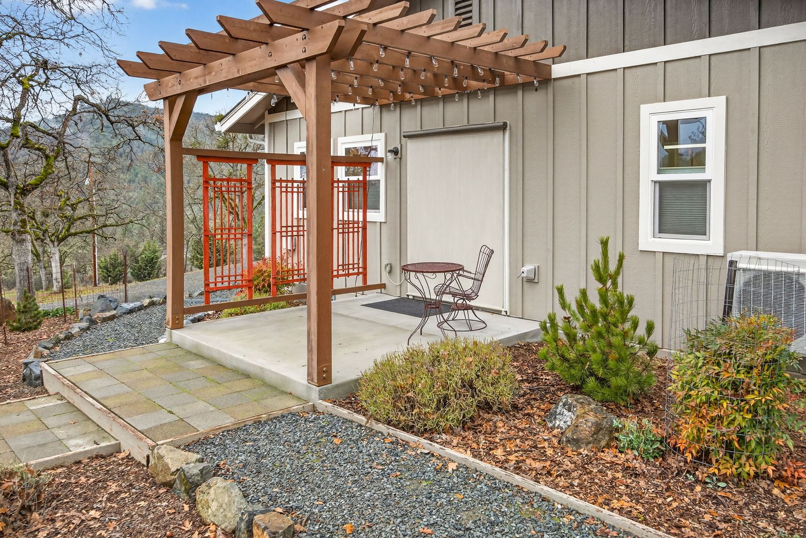 Situated between Jacksonville and Grants Pass, this beautifully maintained country home sits on over 4 acres and offers peaceful Applegate Valley views from the covered front deck. The open-concept 2 BD 2 BA layout features solid oak hardwood floors, vaulted ceilings, and a spacious living room w/ a wood stove that opens to the kitchen and dining area. The kitchen includes granite countertops, a butcher block island, custom cabinetry, stainless appliances, and a farmhouse sink. A generous pantry off the kitchen provides exterior access and connects to the guest bathroom that doubles as a laundry room. The primary suite opens to a private patio overlooking the garden and features an ensuite with walk-in shower, double vanity, and touch-light mirrors. Outside you’ll find a detached 2 car garage, fenced in garden, fruit trees, wood storage, and manicured grounds. Offered on a month-to-month rental agreement, w/ the hope of securing a long-term tenant. Landscape maintenance is included.