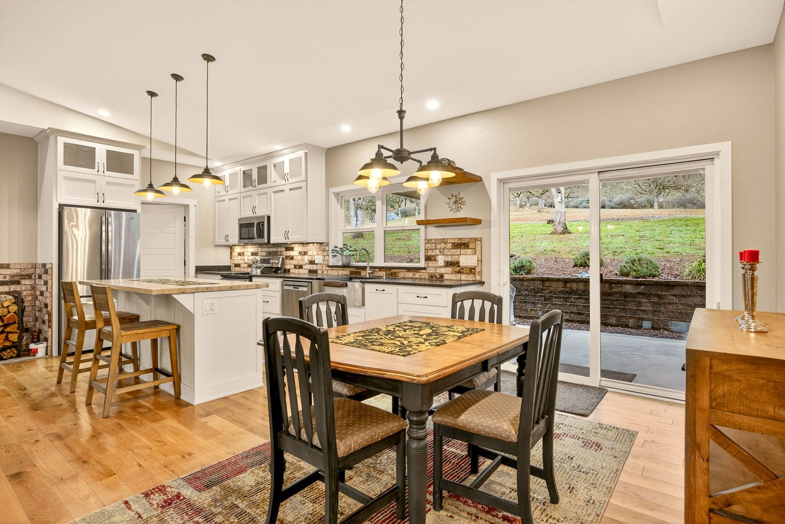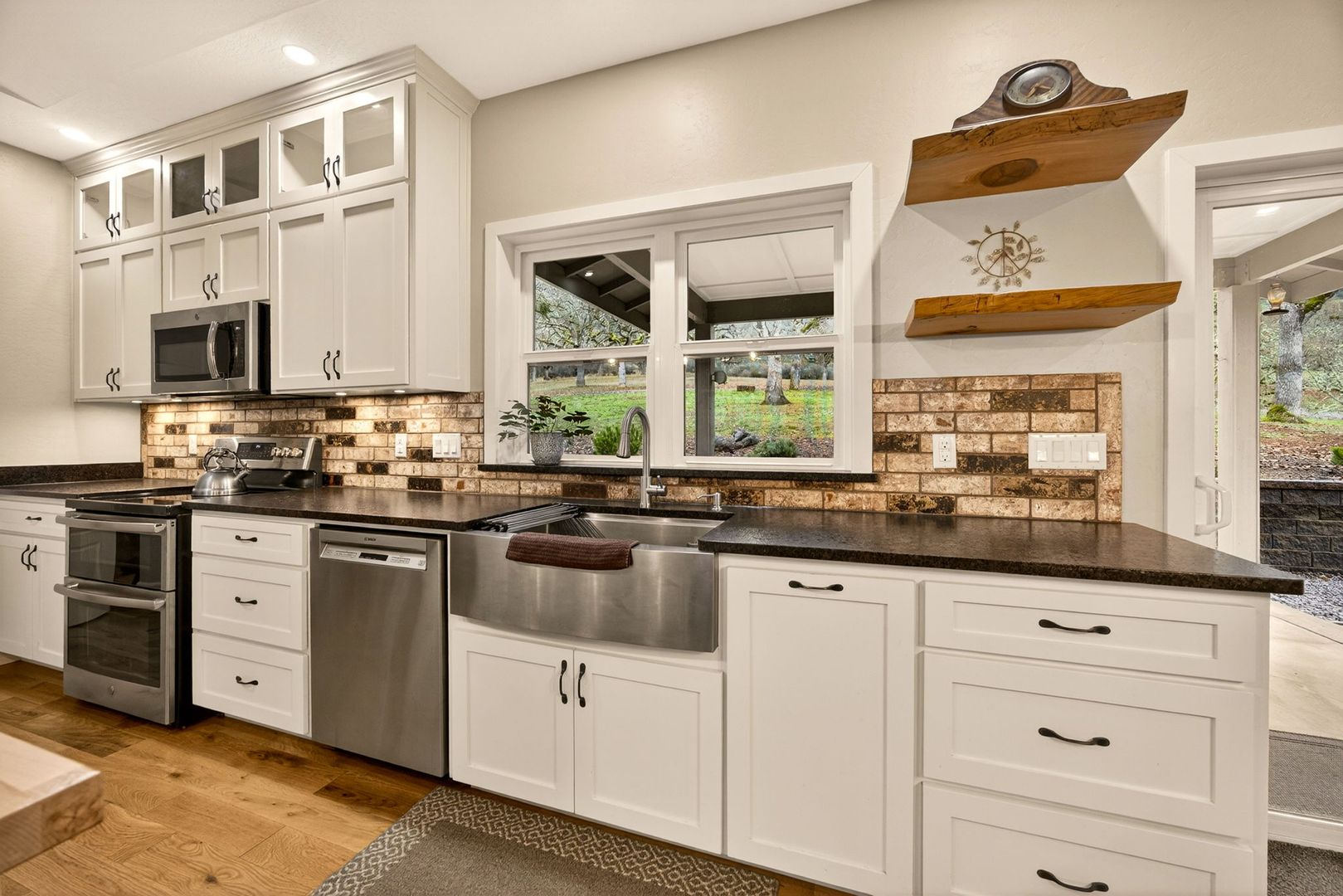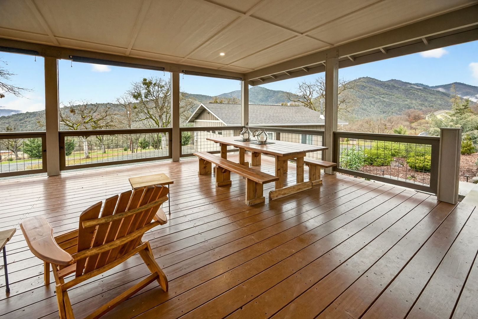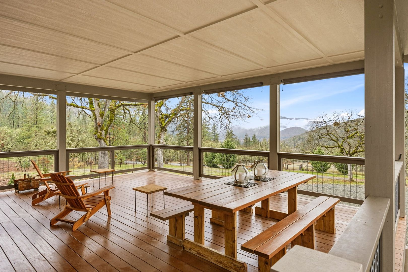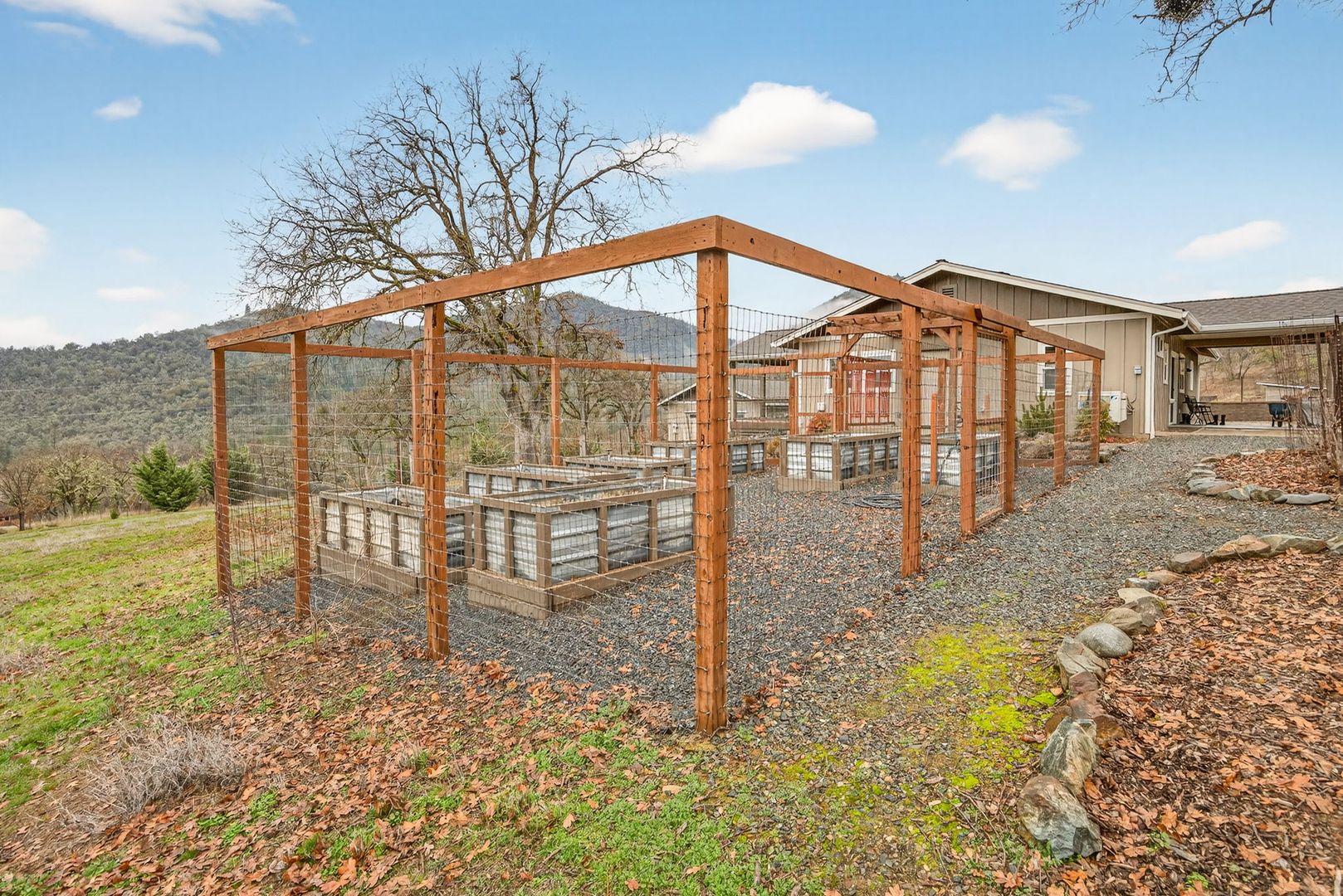 Situated between Jacksonville and Grants Pass, this beautifully maintained country home sits on over 4 acres and offers peaceful Applegate Valley views from the covered front deck. The open-concept 2 BD 2 BA layout features solid oak hardwood floors, vaulted ceilings, and a spacious living room w/ a wood stove that opens to the kitchen and dining area. The kitchen includes granite countertops, a butcher block island, custom cabinetry, stainless appliances, and a farmhouse sink. A generous pantry off the kitchen provides exterior access and connects to the guest bathroom that doubles as a laundry room. The primary suite opens to a private patio overlooking the garden and features an ensuite with walk-in shower, double vanity, and touch-light mirrors. Outside you’ll find a detached 2 car garage, fenced in garden, fruit trees, wood storage, and manicured grounds. Offered on a month-to-month rental agreement, w/ the hope of securing a long-term tenant. Landscape maintenance is included.