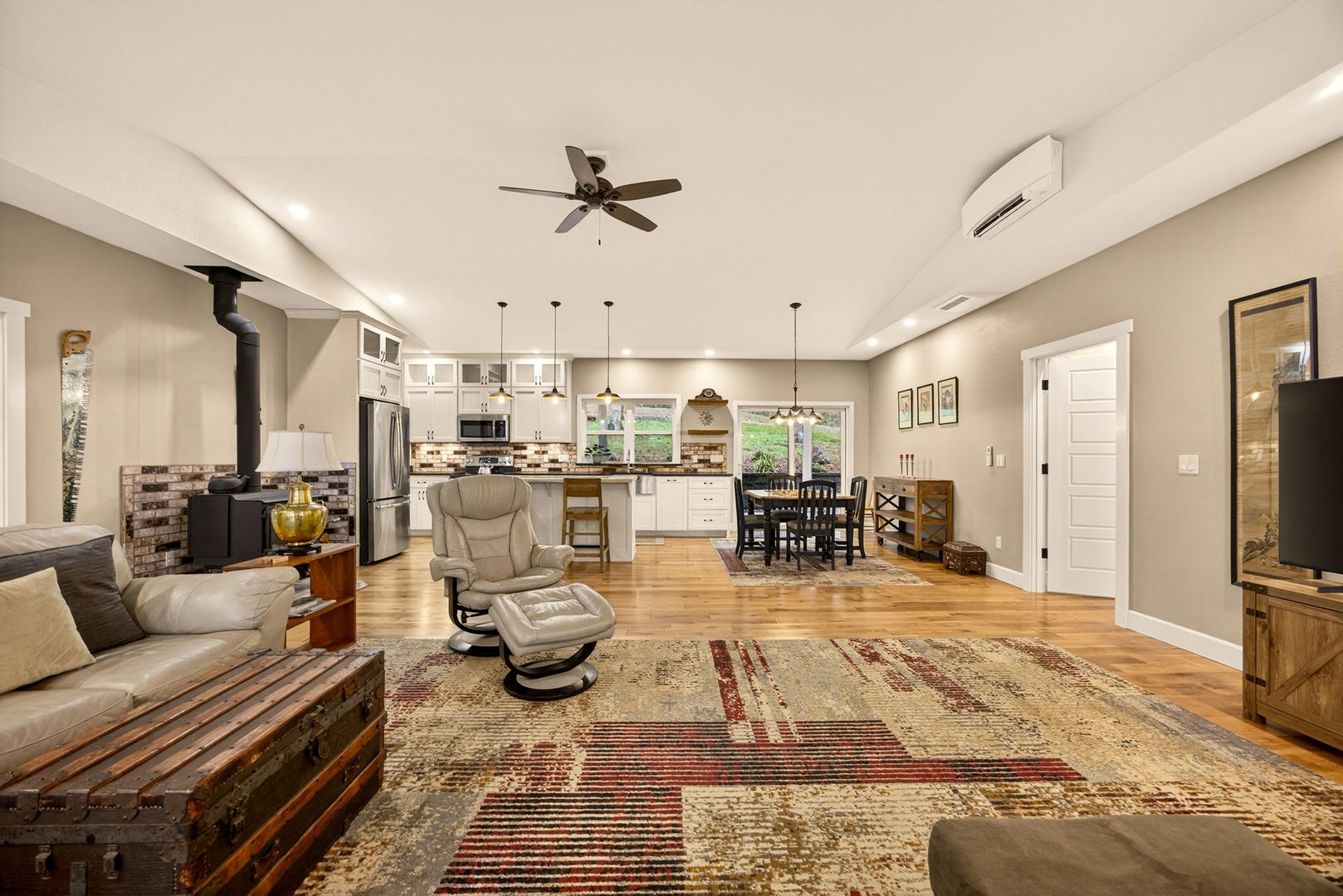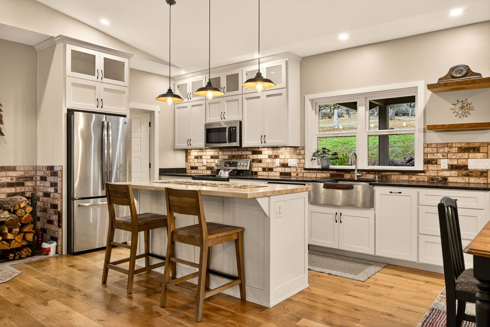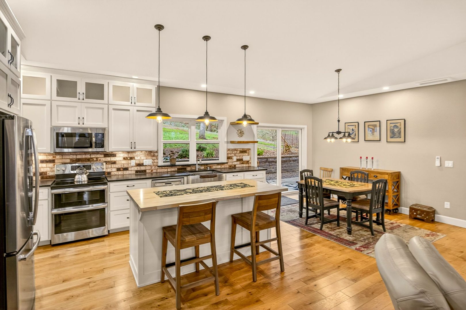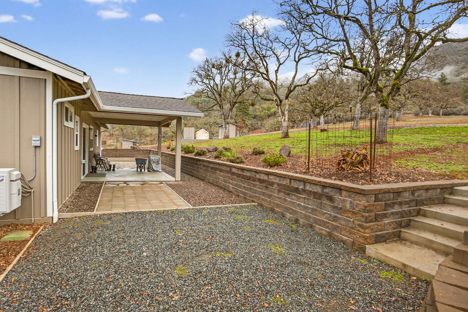 Situated between Jacksonville and Grants Pass, this beautifully maintained country home sits on over 4 acres and offers peaceful Applegate Valley views from the covered front deck. The open-concept 2 BD 2 BA layout features solid oak hardwood floors, vaulted ceilings, and a spacious living room w/ a wood stove that opens to the kitchen and dining area. The kitchen includes granite countertops, a butcher block island, custom cabinetry, stainless appliances, and a farmhouse sink. A generous pantry off the kitchen provides exterior access and connects to the guest bathroom that doubles as a laundry room. The primary suite opens to a private patio overlooking the garden and features an ensuite with walk-in shower, double vanity, and touch-light mirrors. Outside you’ll find a detached 2 car garage, fenced in garden, fruit trees, wood storage, and manicured grounds. Offered on a month-to-month rental agreement, w/ the hope of securing a long-term tenant. Landscape maintenance is included.