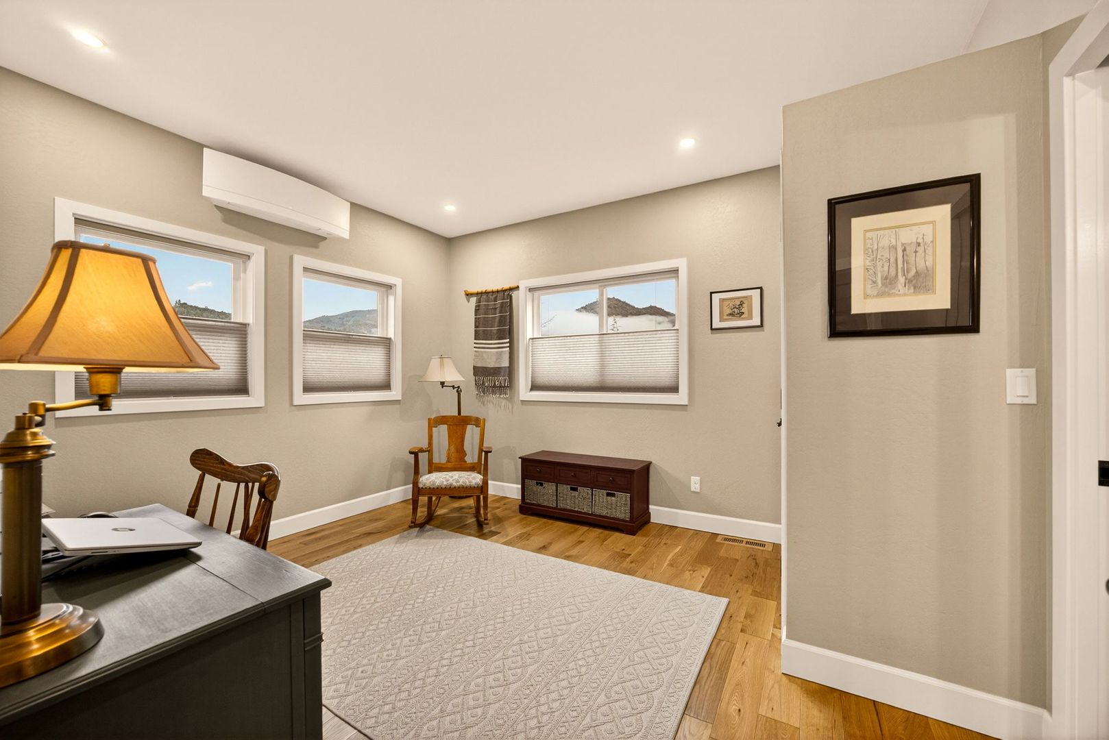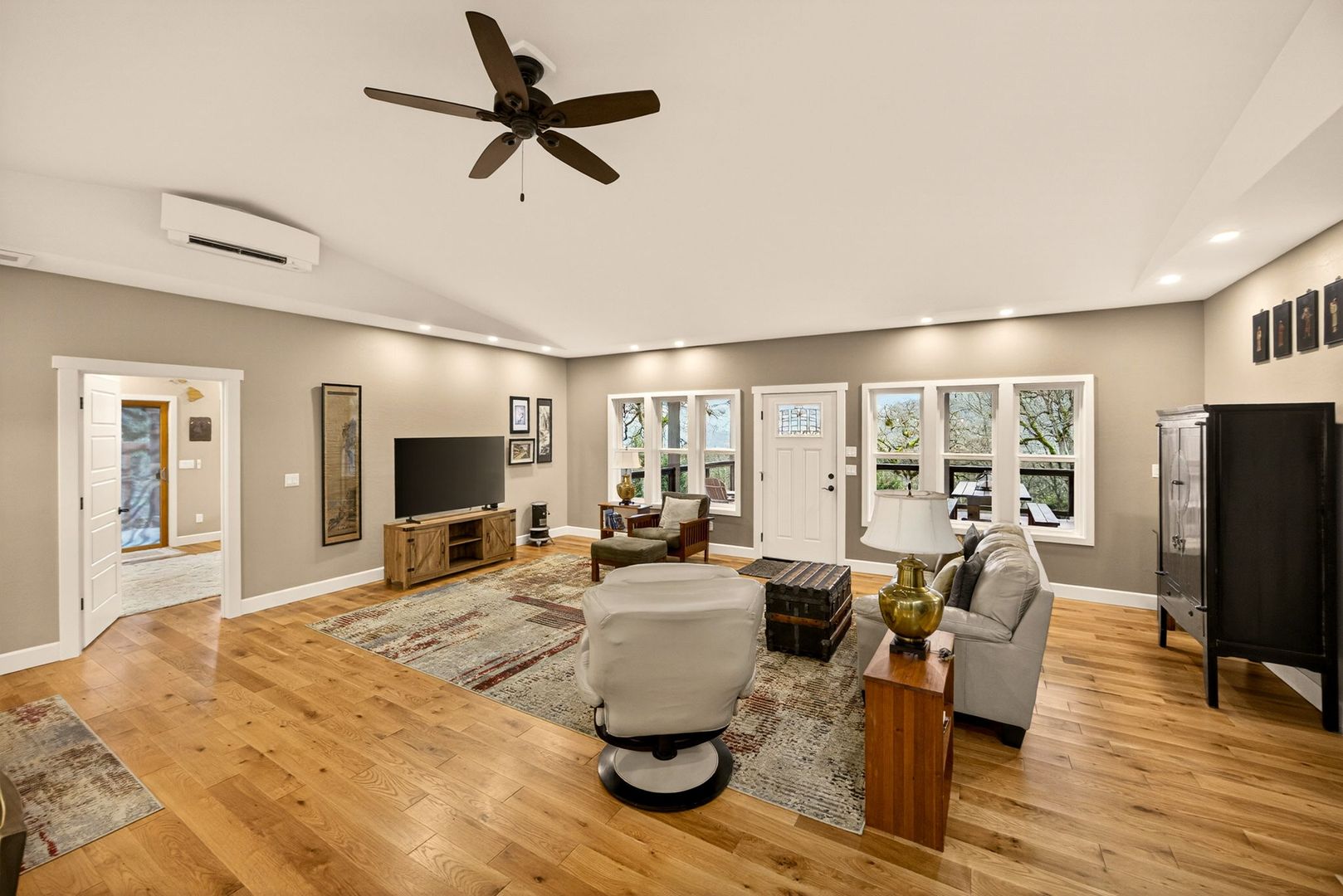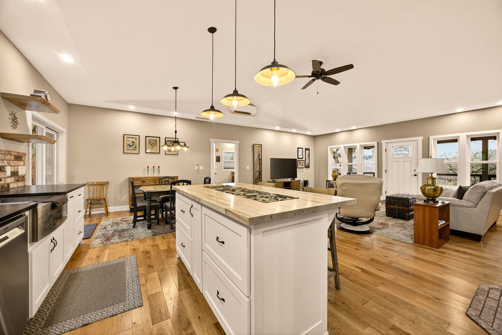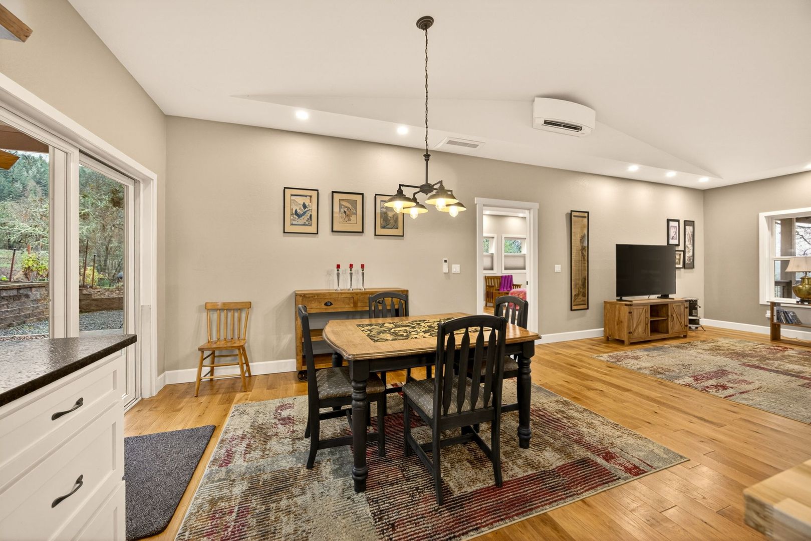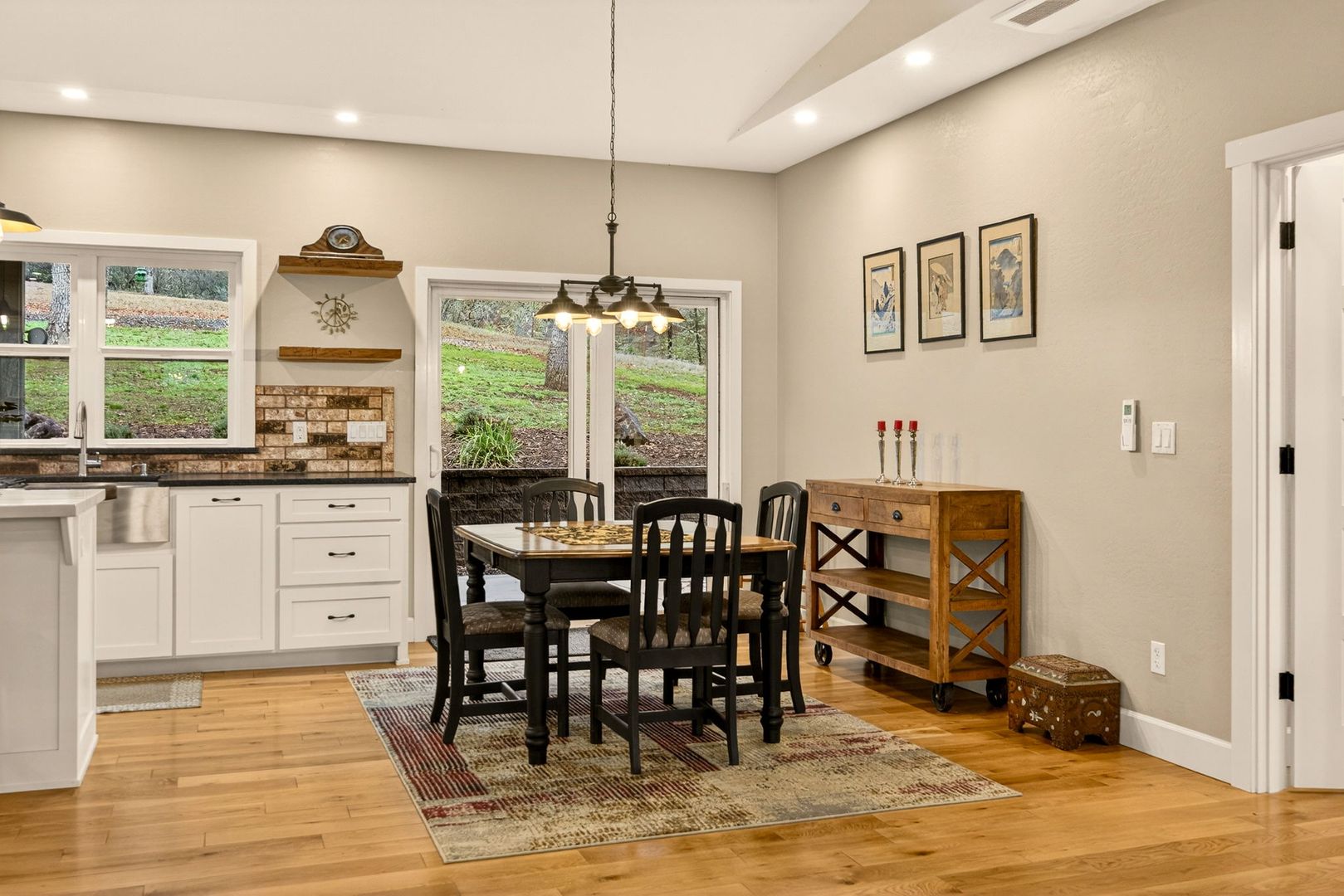 Situated between Jacksonville and Grants Pass, this beautifully maintained country home sits on over 4 acres and offers peaceful Applegate Valley views from the covered front deck. The open-concept 2 BD 2 BA layout features solid oak hardwood floors, vaulted ceilings, and a spacious living room w/ a wood stove that opens to the kitchen and dining area. The kitchen includes granite countertops, a butcher block island, custom cabinetry, stainless appliances, and a farmhouse sink. A generous pantry off the kitchen provides exterior access and connects to the guest bathroom that doubles as a laundry room. The primary suite opens to a private patio overlooking the garden and features an ensuite with walk-in shower, double vanity, and touch-light mirrors. Outside you’ll find a detached 2 car garage, fenced in garden, fruit trees, wood storage, and manicured grounds. Offered on a month-to-month rental agreement, w/ the hope of securing a long-term tenant. Landscape maintenance is included.