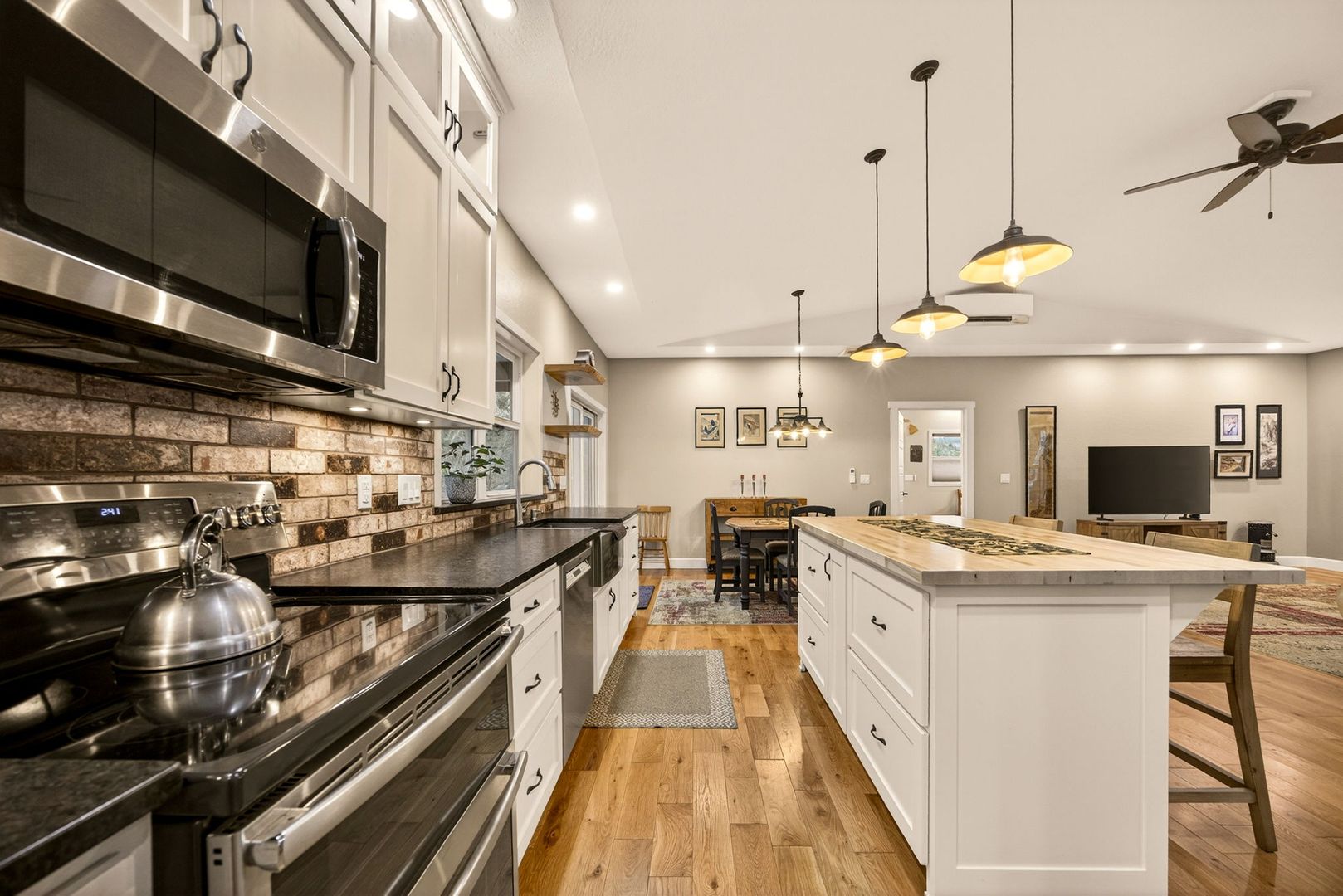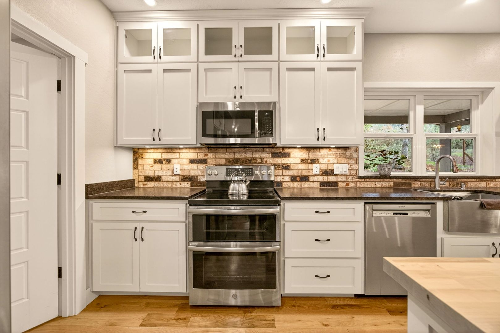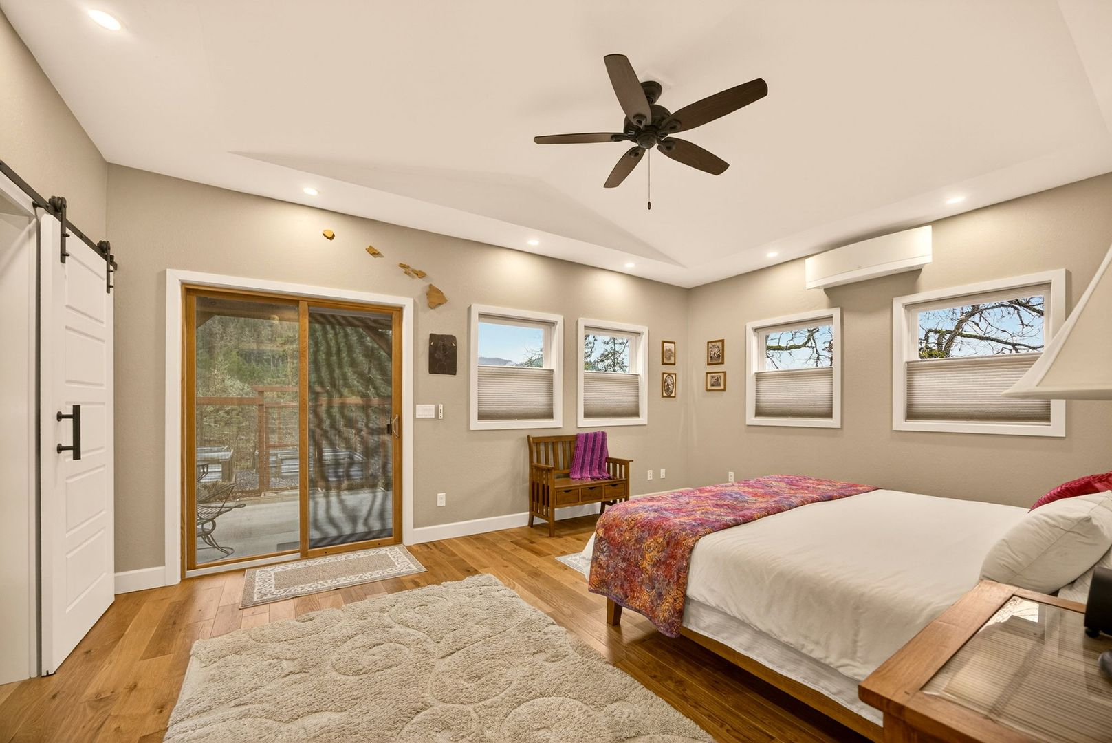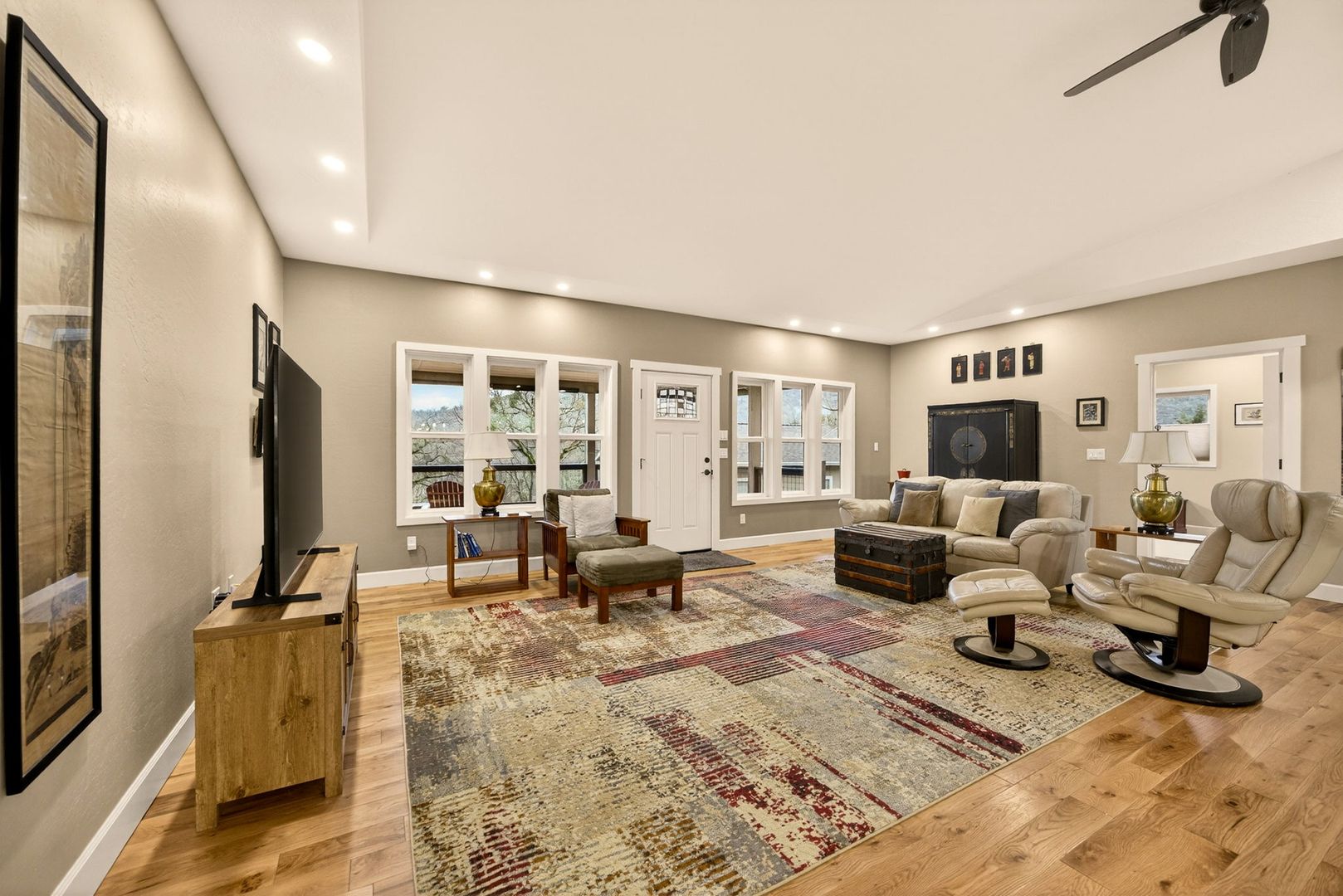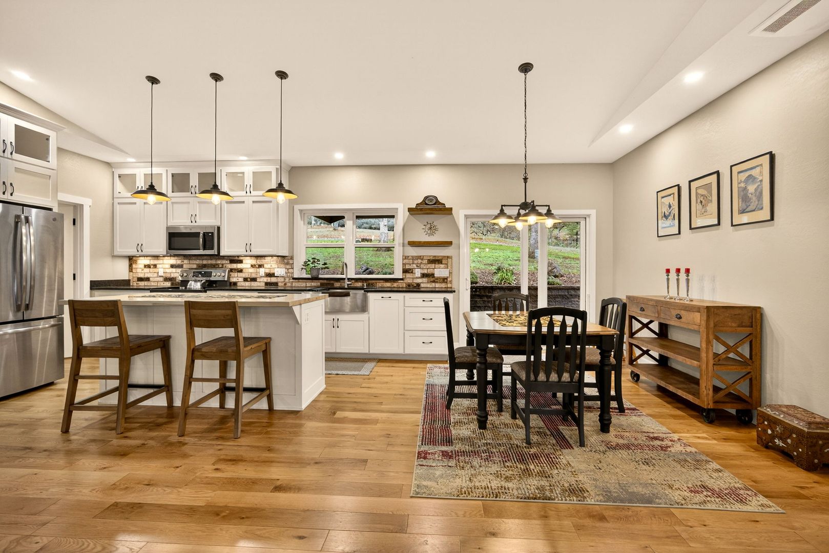 Situated between Jacksonville and Grants Pass, this beautifully maintained country home sits on over 4 acres and offers peaceful Applegate Valley views from the covered front deck. The open-concept 2 BD 2 BA layout features solid oak hardwood floors, vaulted ceilings, and a spacious living room w/ a wood stove that opens to the kitchen and dining area. The kitchen includes granite countertops, a butcher block island, custom cabinetry, stainless appliances, and a farmhouse sink. A generous pantry off the kitchen provides exterior access and connects to the guest bathroom that doubles as a laundry room. The primary suite opens to a private patio overlooking the garden and features an ensuite with walk-in shower, double vanity, and touch-light mirrors. Outside you’ll find a detached 2 car garage, fenced in garden, fruit trees, wood storage, and manicured grounds. Offered on a month-to-month rental agreement, w/ the hope of securing a long-term tenant. Landscape maintenance is included.