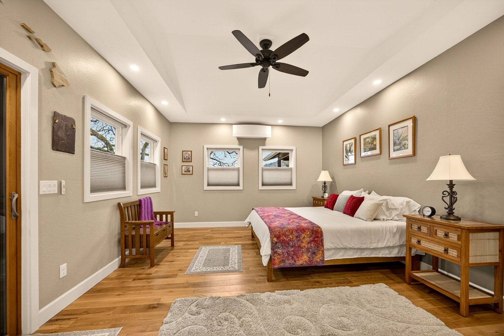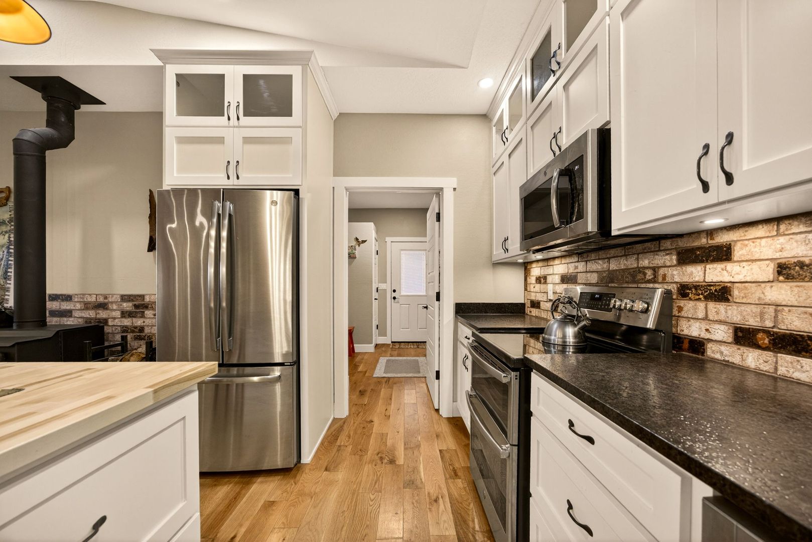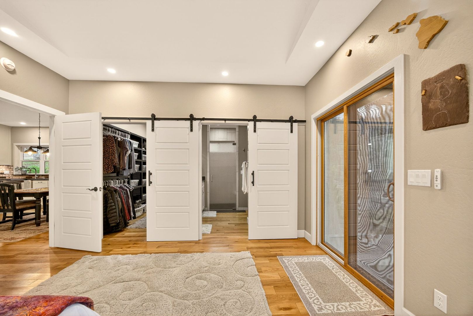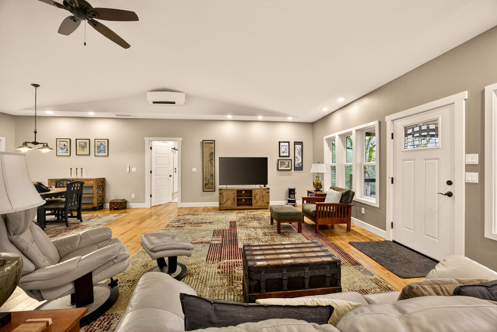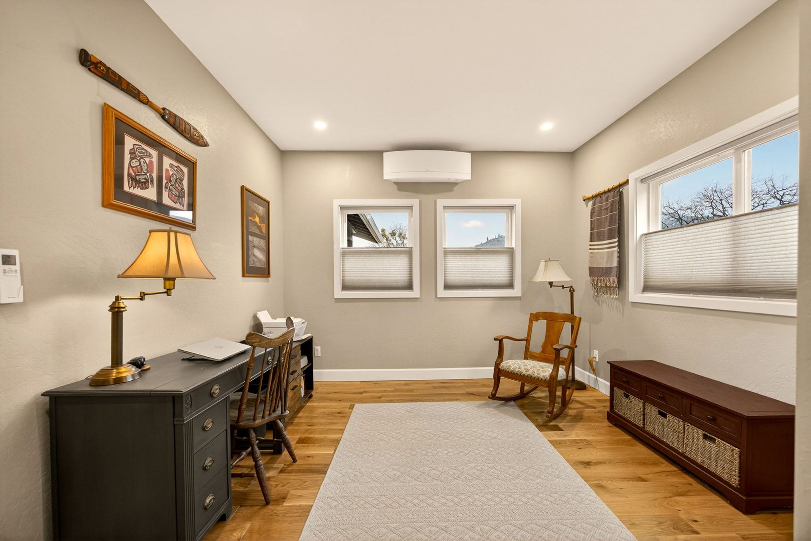 Situated between Jacksonville and Grants Pass, this beautifully maintained country home sits on over 4 acres and offers peaceful Applegate Valley views from the covered front deck. The open-concept 2 BD 2 BA layout features solid oak hardwood floors, vaulted ceilings, and a spacious living room w/ a wood stove that opens to the kitchen and dining area. The kitchen includes granite countertops, a butcher block island, custom cabinetry, stainless appliances, and a farmhouse sink. A generous pantry off the kitchen provides exterior access and connects to the guest bathroom that doubles as a laundry room. The primary suite opens to a private patio overlooking the garden and features an ensuite with walk-in shower, double vanity, and touch-light mirrors. Outside you’ll find a detached 2 car garage, fenced in garden, fruit trees, wood storage, and manicured grounds. Offered on a month-to-month rental agreement, w/ the hope of securing a long-term tenant. Landscape maintenance is included.
